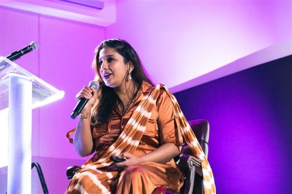 Tania Kottoor, founder and CEO of West by East, began her presentation by telling the story of a first-generation Indian-American woman who grew up in a Catholic community and also enjoyed watching Bollywood films, envisioning herself as a traditional bride in a sari.