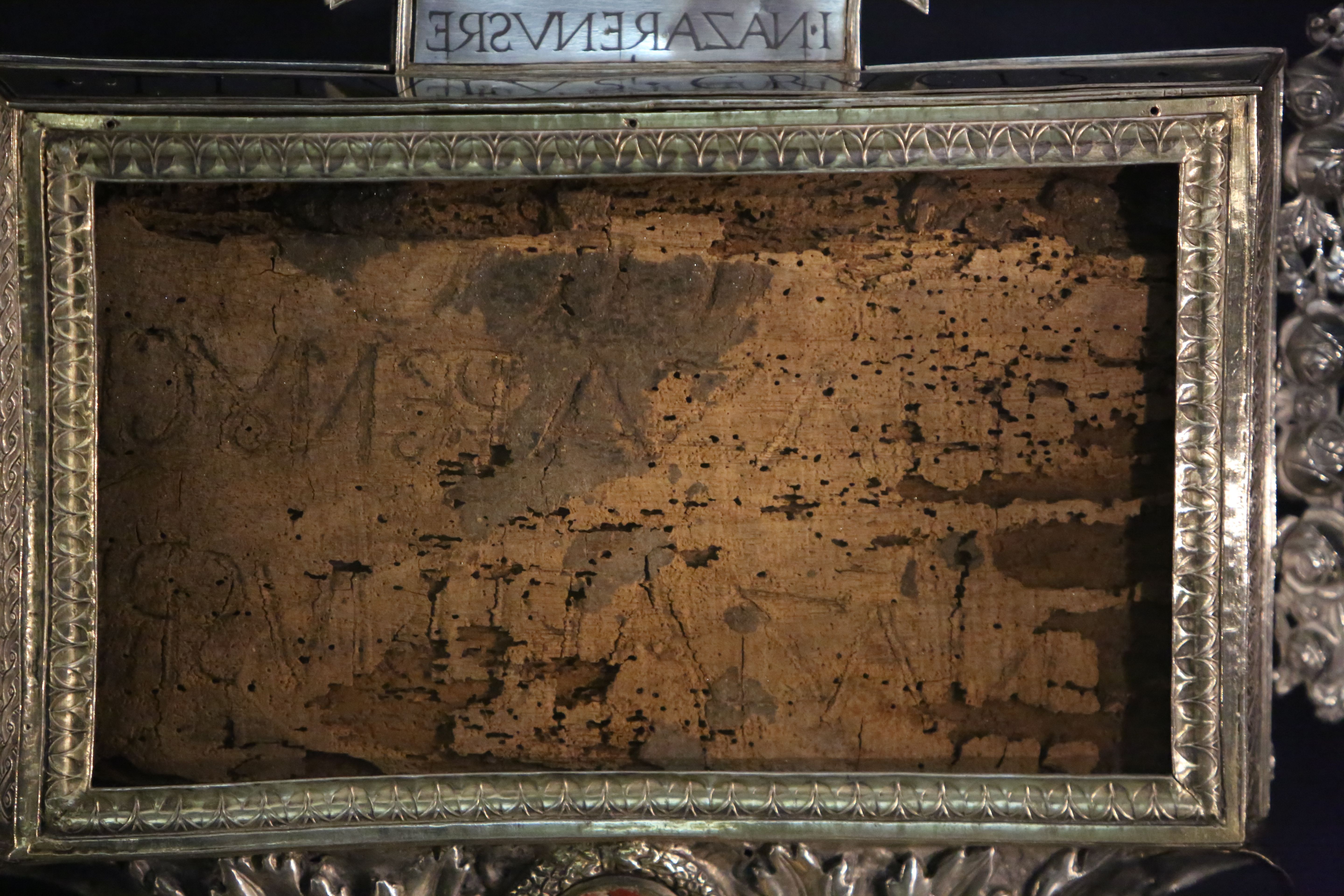 The exhibit includes a handful of relics from the passion of Jesus Christ: a small splinter of the cross, a piece of the crown of thorns, a piece of Christ’s tomb, and a piece of the column on which Christ was whipped before his crucifixion. It also includes relics from the Nativity, such as a piece of the Blessed Mother’s veil, a piece of Christ’s crib, and parts of the bones of the three Wise Men.