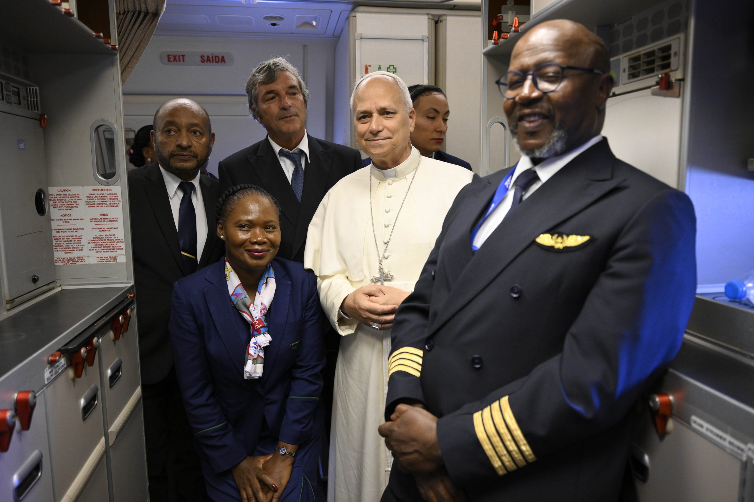 Pope Leo XIV stands with airline staff en route to Mengomeyén, Equatorial Guinea, Wednesday, April 22, 2026. | Credit: Vatican Media